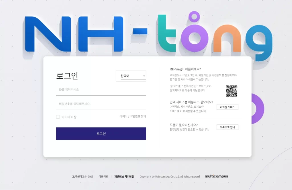 • nh-tong 농협 통합교육시스템은 NH농협 임직원과 농업인을 대상으로 하므로, 가입하려면 NH농협에 소속되어 있거나 NH농협의 고객이어야 합니다.